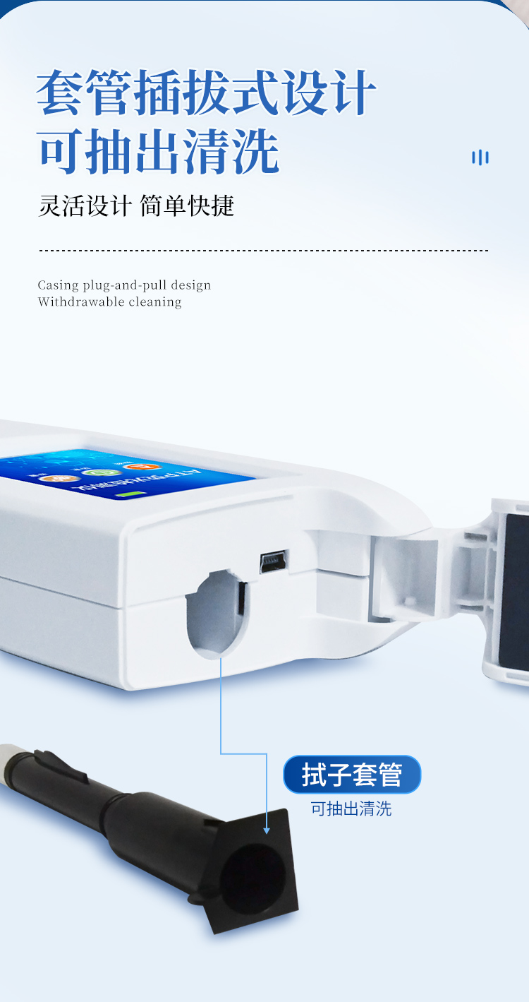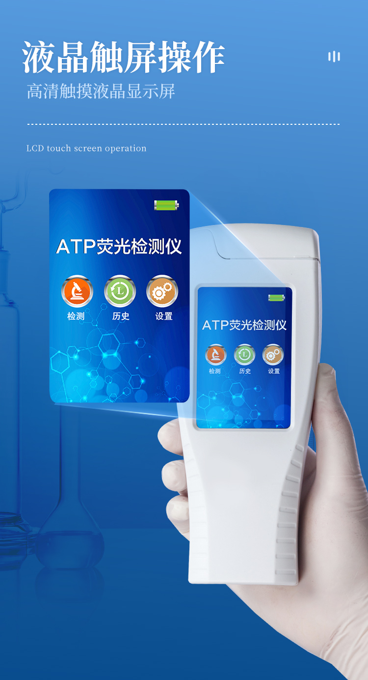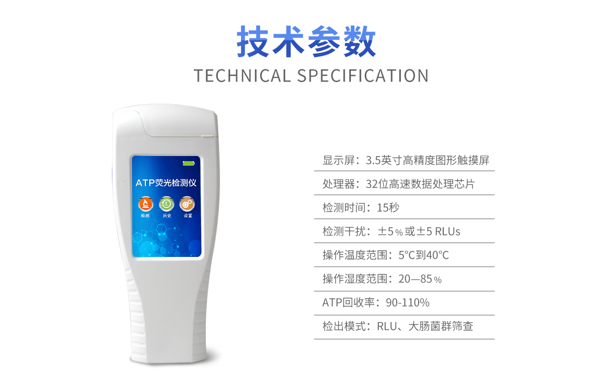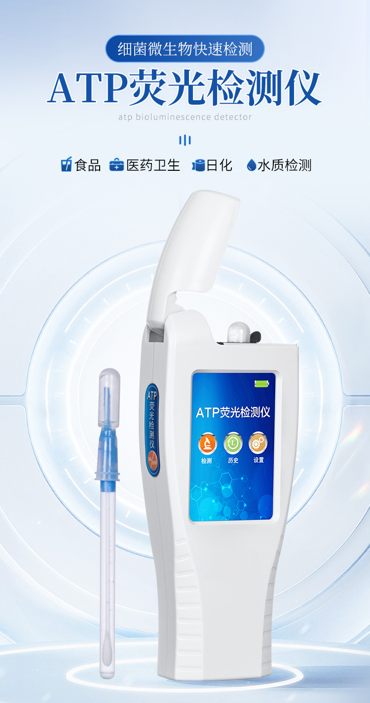 該設(shè)備采用生物化學(xué)反應(yīng)方法檢測ATP含量,潔凈度檢測儀基于螢火蟲發(fā)光原理,利用“熒光素酶—熒光素體系”快速檢測三磷酸腺苷(ATP)。ATP拭子含有可以裂解細(xì)胞膜的試劑,能將細(xì)胞內(nèi)ATP釋放出來,與試劑中含有的特異性酶發(fā)生反應(yīng),產(chǎn)生光,再用熒光照度計檢測發(fā)光值,微生物的數(shù)量與發(fā)光值成正比,由于所有生物活細(xì)胞中含有恒量的ATP,所以ATP含量可以清晰地表明樣品中微生物與其他生物殘余的多少,用于判斷衛(wèi)生狀況。