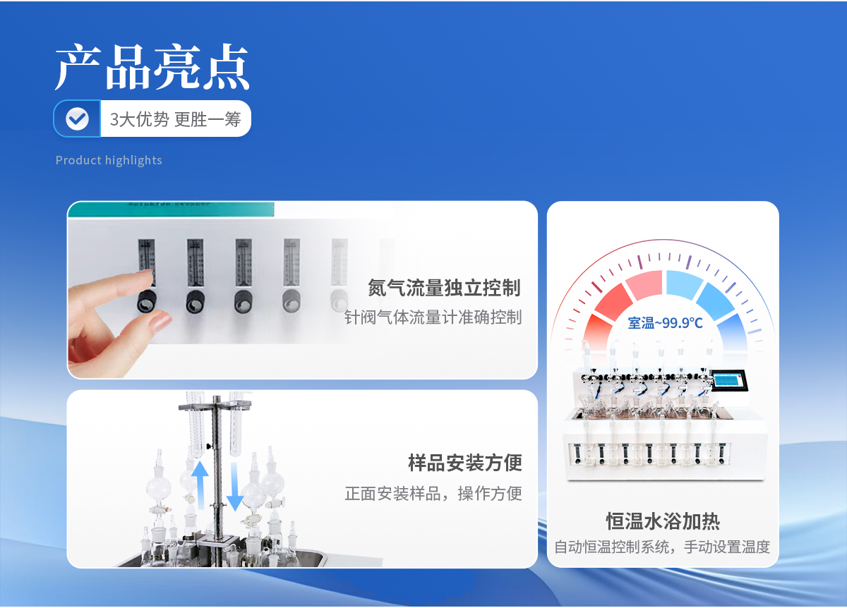 1、大容量反應瓶,可同時處理多個樣品。    2、鹽酸口、氣體進口、出口三口一體且相互獨立,操作會不干擾。    3、恒溫水浴加熱,具有快速自動恒溫控制系統,加熱溫度可以手動設定。    4、由升降位置固定旋鈕調節樣品架及配氣系統的升降旋轉樣品架,正面安裝樣品,操作方便。    5、每個樣品的氮氣流量獨立控制調節或關閉,針閥氣體流量計準確控制和顯示氣體總消耗量。