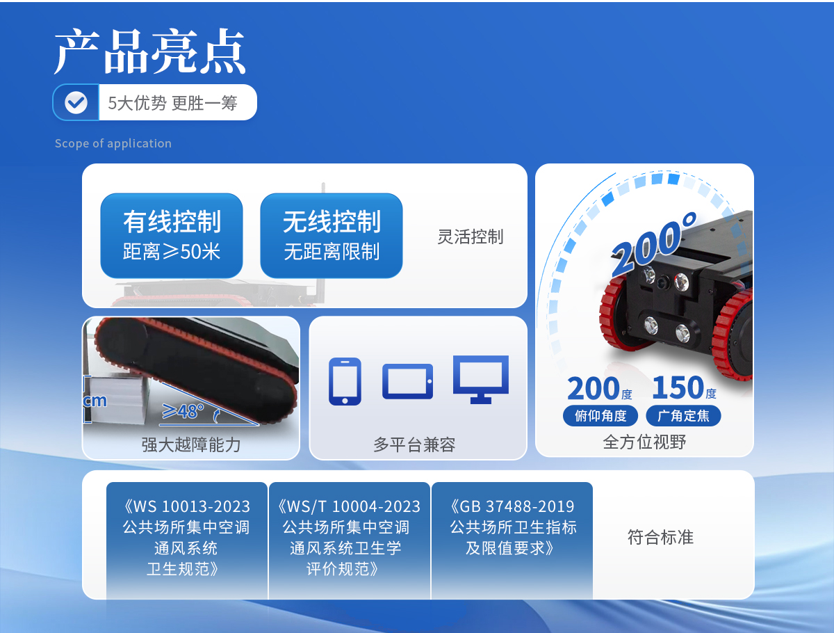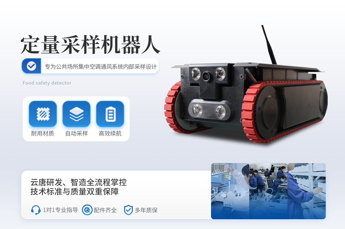 合規性:完全符合《WS 10013-2023》、《WS/T 10004-2023》及《GB 37488-2019》中對集中空調定量采樣機器人的要求。    緊湊設計:尺寸長寬高310mm * 160mm * 100mm,可進入*小尺寸為100×160毫米的矩形鐵皮風管內部進行采樣。    精準采樣:提供刮拭法和擦拭法兩種采樣方法,采樣器取樣面積50平方厘米,密閉雙采樣器加裝氣流回風道,并使用光固化3D打印技術制造,保障了采樣面積的有效性。布條和擁有專利設計的刮板夾安裝方便快捷,現場操作時可**限度地杜絕二次污染,實現無菌操作。采樣誤差小于5%,采樣偏差小于3%。    全方位視野:前置攝像頭俯仰角度達200度,前后均采用150度廣角定焦攝像頭,提供無死角視野。    靈活控制:支持無線與有線兩種控制方式,有線控制距離≥50米,無線控制無距離限制。視頻采集、拍照及機器人控制均由終端完成。    強大越障能力:越障礙高度≥7cm,爬坡角度≥48度,整機含電池工作重量僅為4.0KG。    全自動采樣:軟件控制加入了《集塵量采樣》與《微生物采樣》的全自動一鍵采樣功能,無需人工干預即可完成所有采樣動作。    耐用材質:整機不低于95%的材料使用航空鋁合金,表面經過氧化噴砂處理并增厚鈍化膜,增加表面硬度。機體行走模塊一體成型,總重不超過4KG。    多平臺兼容:支持安卓系統、鴻蒙系統的手機、平板、電腦進行控制操作。    **續航:配備4000mAh容量的動力電池,充電時間≤4小時,單次充電后可持續運行約5-6小時。