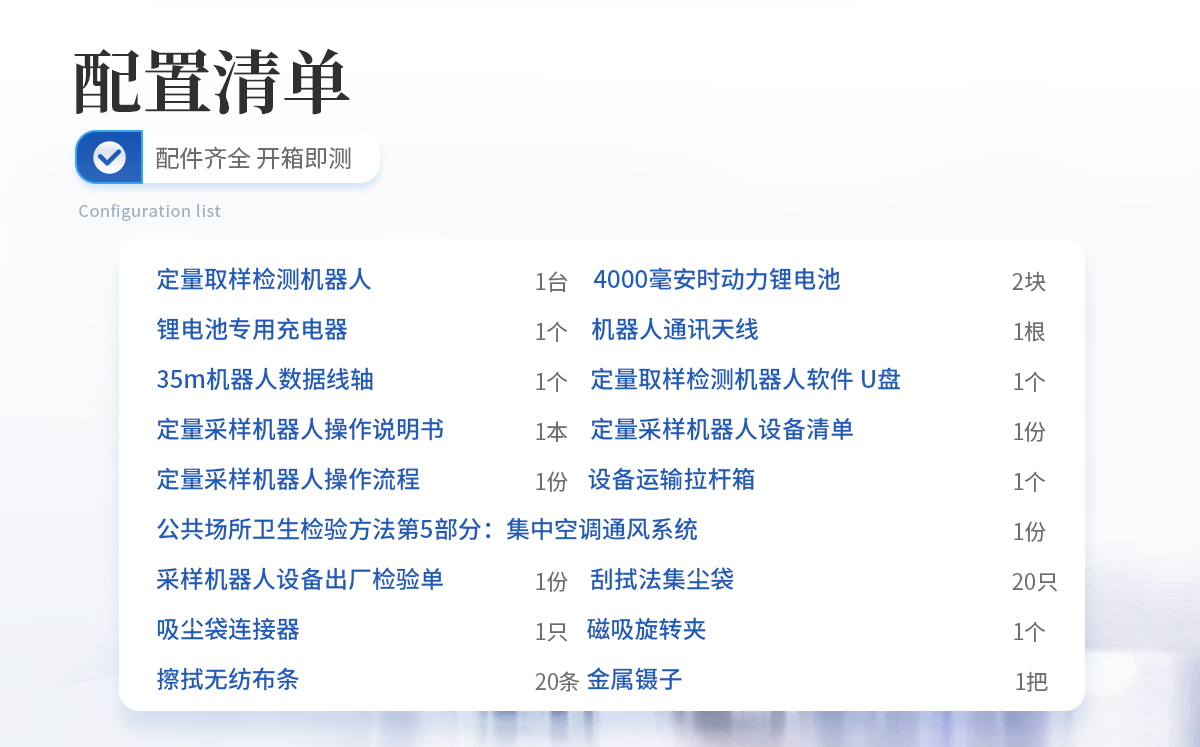 定量取樣檢測機器人:1臺    4000毫安時動力鋰電池:2塊    鋰電池專用充電器:1個    機器人通訊天線:1根    35m機器人數據線軸:1個    定量取樣檢測機器人軟件 U盤:1個    定量采樣機器人操作說明書:1本    定量采樣機器人設備清單:1份    定量采樣機器人操作流程:1份    公共場所衛生檢驗方法第5部分:集中空調通風系統:1份    采樣機器人設備出廠檢驗單:1份    刮拭法集塵袋 :20只    吸塵袋連接器 :1只    磁吸旋轉夾:1個    擦拭無紡布條 :20條    金屬鑷子:1把    設備運輸拉桿箱:1個