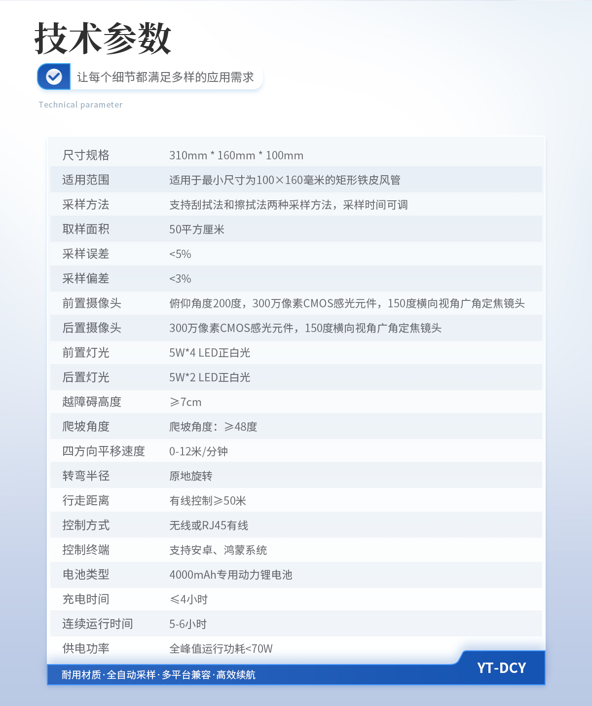 尺寸規格:310mm * 160mm * 100mm;    適用范圍:適用于*小尺寸為100×160毫米的矩形鐵皮風管;    采樣方法:支持刮拭法和擦拭法兩種采樣方法,采樣時間可調;    取樣面積:50平方厘米;    采樣誤差:<5%;    采樣偏差:<3%;    前置攝像頭:俯仰角度200度,300萬像素CMOS感光元件,150度橫向視角廣角定焦鏡頭;    后置攝像頭:300萬像素CMOS感光元件,150度橫向視角廣角定焦鏡頭;    前置燈光:5W*4 LED正白光;    后置燈光:5W*2 LED正白光;    越障礙高度:≥7cm;    爬坡角度:≥48度;    四方向平移速度:0-12米/分鐘;    轉彎半徑:原地旋轉;    行走距離:有線控制≥50米;    控制方式:無線或RJ45有線;    控制終端:支持安卓、鴻蒙系統;    電池類型:4000mAh專用動力鋰電池;    充電時間:≤4小時;    連續運行時間:5-6小時;    供電功率:全峰值運行功耗<70W;