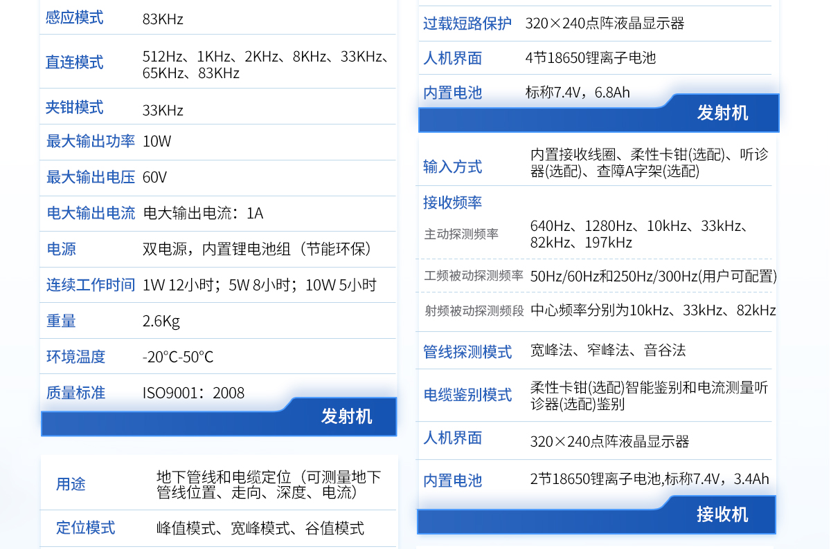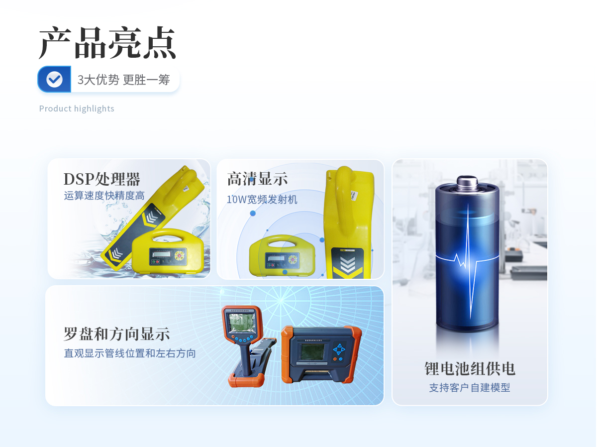 1、采用DSP處理器,運算速度快,精度更高;2、帶有導向功能指標管線走向,定位更快;3、采用10W寬頻發射機,適應各種環境的探測;4、接收機和發射機都采用鋰電池組供電,節能環保,每年可節省3000-5000元的電池費用。