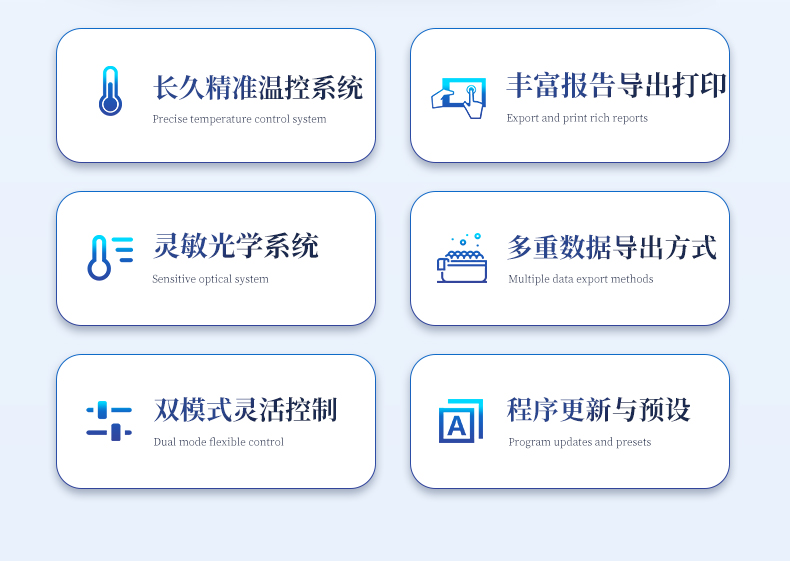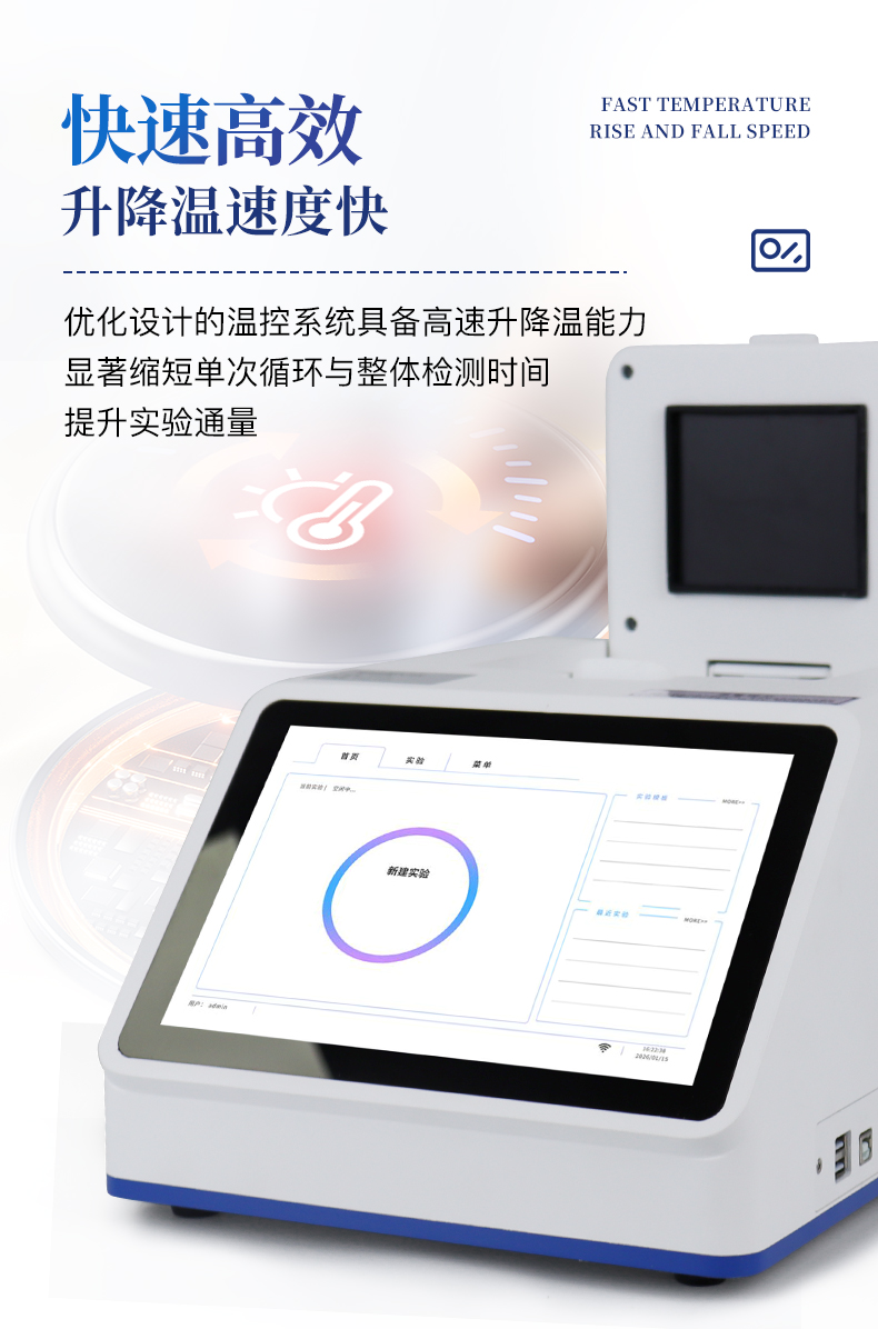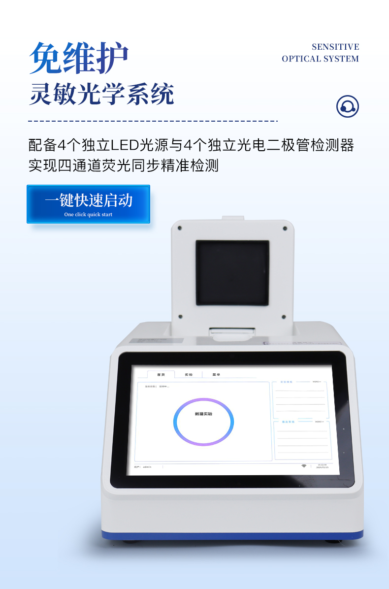 | 1.智能操作系統(tǒng),實(shí)驗(yàn)盡在掌握 | A雙模式靈活控制:支持通過儀器觸摸屏獨(dú)立運(yùn)行,也支持通過電腦軟件進(jìn)行遠(yuǎn)程控制與數(shù)據(jù)管理,適應(yīng)不同實(shí)驗(yàn)場(chǎng)景需求。 | B程序更新與預(yù)設(shè):支持在線更新實(shí)驗(yàn)程序,并內(nèi)置豐富的預(yù)設(shè)實(shí)驗(yàn)程序模板,用戶亦可自定義保存常用模版,實(shí)現(xiàn)一鍵快速啟動(dòng),極大提升操作效率。 | C極簡啟動(dòng)體驗(yàn)(可選配):可定制集成攝像頭掃描系統(tǒng),用戶只需掃描樣品板或程序卡的二維碼,即可自動(dòng)識(shí)別并調(diào)用對(duì)應(yīng)實(shí)驗(yàn)程序,簡化流程,避免人為設(shè)置錯(cuò)誤。 | D操作簡單:無論是觸摸屏界面還是電腦軟件,均設(shè)計(jì)得直觀易懂,新用戶也能快速上手。預(yù)置常用程序模板,進(jìn)一步簡化操作流程。 | 2.精準(zhǔn)穩(wěn)定的溫控與光學(xué)核心 | A長久精準(zhǔn)的溫控系統(tǒng):采用進(jìn)口***TEC半導(dǎo)體制冷模塊,控溫精準(zhǔn)(±0.1°C),孔間溫度均勻性**(≤±0.3°C)。系統(tǒng)穩(wěn)定性卓越,長期使用性能衰減小,校準(zhǔn)周期長達(dá)數(shù)年,顯著降低維護(hù)成本與運(yùn)營中斷。 | B免維護(hù)的靈敏光學(xué)系統(tǒng):配備4個(gè)獨(dú)立LED光源與4個(gè)獨(dú)立光電二極管檢測(cè)器,實(shí)現(xiàn)四通道熒光同步精準(zhǔn)檢測(cè)。采用超長壽命進(jìn)口光源,設(shè)計(jì)壽命期內(nèi)免維護(hù),無需額外校準(zhǔn)或更換,保障檢測(cè)結(jié)果長期一致性與高靈敏度。 | C卓越的數(shù)據(jù)質(zhì)量:實(shí)驗(yàn)線性相關(guān)性高(R2≥0.999),重復(fù)性優(yōu)異(孔間CV值低),確保定量結(jié)果準(zhǔn)確可靠,數(shù)據(jù)置信度高 | 3.**便捷的數(shù)據(jù)與輸出管理 | A多重?cái)?shù)據(jù)導(dǎo)出方式:支持通過USB存儲(chǔ)設(shè)備直接拷貝,或經(jīng)由Wi-Fi無線網(wǎng)絡(luò)傳輸數(shù)據(jù)至本地服務(wù)器或云端,方便靈活,滿足各類實(shí)驗(yàn)室數(shù)據(jù)管理習(xí)慣。 | B豐富的報(bào)告導(dǎo)出與打印:支持生成并導(dǎo)出多種格式(如PDF、Excel)的實(shí)驗(yàn)報(bào)告。儀器兼容USB熱敏打印機(jī)、藍(lán)牙無線打印機(jī)及常規(guī)A4打印機(jī),可直接在儀器上或通過電腦一鍵導(dǎo)出并打印專業(yè)報(bào)告,便于結(jié)果存檔與即時(shí)分享。 | 4.快速**與堅(jiān)固耐用 | A升降溫速度快:優(yōu)化設(shè)計(jì)的溫控系統(tǒng)具備高速升降溫能力,顯著縮短單次循環(huán)與整體檢測(cè)時(shí)間,提升實(shí)驗(yàn)通量。 | B超長使用壽命:核心部件均選用工業(yè)級(jí)耐用材料與設(shè)計(jì),整機(jī)運(yùn)行穩(wěn)定可靠,致力于為用戶提供長久的投資回報(bào)。 |