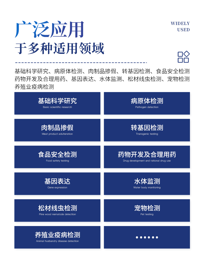非洲豬瘟檢測(cè)儀配套非洲豬瘟病毒熒光pcr檢測(cè)試劑盒、非洲豬瘟病毒熒光pcr核酸檢測(cè)試劑盒均已經(jīng)獲得農(nóng)業(yè)農(nóng)村部產(chǎn)品批準(zhǔn),可以滿足非洲豬瘟核酸現(xiàn)場(chǎng)快速檢測(cè)需求。可定量快速畜牧類疾病診斷如非洲豬瘟、禽流感、豬瘟、豬藍(lán)耳、偽狂犬等疾病,廣泛應(yīng)用于養(yǎng)殖場(chǎng)、屠宰場(chǎng)、食品加工廠、肉產(chǎn)品深加工企業(yè)、農(nóng)業(yè)農(nóng)村部、畜牧局、檢驗(yàn)檢疫單位使用。