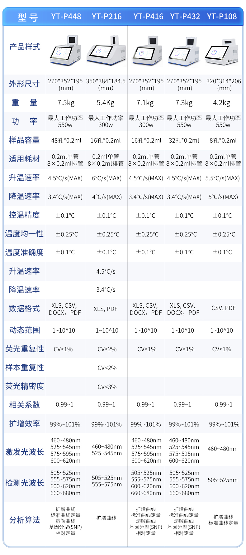 | 基本性能 | 外形尺寸:270*352*195 (mm) | 重量:7.1kg | 電源:220V | 功率:**工作功率300w | 操作系統(tǒng):自帶Android操作系統(tǒng) | 外接電腦:外接windows電腦(win7系統(tǒng)以上) | 系統(tǒng)語言:中英文實(shí)時(shí)切換 | 通信接口:方形USB | 操作環(huán)境參數(shù) | 操作環(huán)境溫度:18~35℃ | 操作環(huán)境相對(duì)濕度:0%~85% | 運(yùn)輸及儲(chǔ)存溫度:-20~55℃ | 運(yùn)輸及儲(chǔ)存相對(duì)濕度:0%~85% | 系統(tǒng)性能 | 樣品容量:16孔*0.2ml | 樣品容積:15~100ul | 適用耗材:0.2ml單管、8×0.2ml排管 | 控溫范圍:4~99℃ | 熱蓋溫度:30℃-108℃(默認(rèn)105℃,熱蓋溫度可調(diào)) | 溫控方式:高性能進(jìn)口半導(dǎo)體 | 梯度控溫:3模塊梯度控溫,**溫差支持35℃ | 升溫速率:4.5℃/s(MAX) | 降溫速率:3.4℃/s(MAX) | 控溫精度:±0.1℃ | 溫度均一性 :±0.25℃ | 溫度準(zhǔn)確度:±0.1℃ | 操作功能:預(yù)設(shè)項(xiàng)目和分析參數(shù),操作簡單方便 | 報(bào)告:支持報(bào)告自定義模塊,16孔分項(xiàng)目打印 | 分析功能:具多重qPCR數(shù)據(jù)分析功能,可同時(shí)檢測(cè)4個(gè)檢測(cè)通道 | 斷電保護(hù):可以一鍵重啟中斷的實(shí)驗(yàn) | 儀器信息:擁有故障記錄,分析,提示的功能,更方便遠(yuǎn)程解決問題 | 分析算法:擴(kuò)增曲線,標(biāo)準(zhǔn)曲線定量、熔解曲線,基因分型(SNP),相對(duì)定量 | 支持HRM檢測(cè):支持 | 數(shù)據(jù)導(dǎo)出:可將實(shí)驗(yàn)結(jié)果以圖形和表格的形式直接導(dǎo)出;詳細(xì)的數(shù)據(jù)報(bào)告內(nèi)容包括實(shí)驗(yàn)條件,數(shù)據(jù)坐標(biāo)和表格,數(shù)據(jù)分析參數(shù)。 | 數(shù)據(jù)格式:XLS, CSV, DOCX,PDF | TouchDown功能:支持時(shí)間和溫度遞增遞減模式 | 熒光檢測(cè)系統(tǒng)性能 | 檢測(cè)靈敏度:可檢測(cè)單拷貝基因 | 動(dòng)態(tài)范圍:1~10^10 | 熒光重復(fù)性:CV<1%(使用某品牌試劑做16孔均一性實(shí)驗(yàn),16個(gè)孔的Ct差值保持在0.5以內(nèi),CV保持在1%以內(nèi)。) | 相關(guān)系數(shù):0.99~1(每種濃度3個(gè)重復(fù),梯度曲線的相關(guān)系數(shù)>0.99,擴(kuò)增效率保持在99%~101%之間) | 擴(kuò)增效率:99%~101% | 可信度:區(qū)分1000與2000拷貝濃度差異 | 激光光源:大功率LED(免維護(hù),壽命長) | 檢測(cè)器:高靈敏度光電傳感器 | 激發(fā)和檢測(cè)傳播介質(zhì):耐高溫專業(yè)導(dǎo)光光纖 | 激發(fā)光波長 :460nm~480nm , 525nm~545nm, 575nm~595nm ,600nm~620nm | 檢測(cè)光波長 :505nm~525nm , 555nm~575nm , 600nm~620nm , 660nm~680nm |