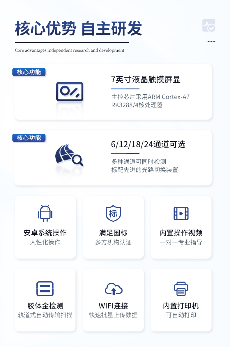 | 該儀器通過光電子技術對反應生成物的反射率進行分析測試,定量或定性分析樣品中待測物的含量。 | 安卓智能操作系統,7英寸高靈敏真彩觸摸屏,更加**和人性化操作, | 儀器具有4G無線聯網、wifi聯網上傳、GPRS無線遠傳功能,快速上傳數據。 | 便攜式儀器,便于現場攜帶操作,主機重量不大于3kg。 | 具有可見光光源,可檢測可見光信號,檢測值0~30000。 | 具有常用打印機數據線接口,直接打印結果;配備USB接口,可連接網絡。 | 具有多個食品安全檢測項目,開放平臺,可以增減檢測項目。 | 檢測通道:12個檢測通道,可以同時測試多個樣品,每個樣品由程序控制分別獨立工作,不會互相干擾。 | 以模擬反射率的標準片為50%附近時為代表,精密度CV值≤0.8%。 | 供電電源:(220±22V)~50Hz±1Hz,供電電源電壓波動不應超過220V AC±10%。 | 內置打印機,實時打印檢測結果。內置大容量電池,便于現場執法檢測。 | 高靈敏度,高檢測精度,高重復性精度,掃描式高精度光學傳感器。 | 機身儲存上萬條檢測結果,也可以導出儲存。 | 開放端口,可連接監管平臺數據庫,界面有上傳操作。 |