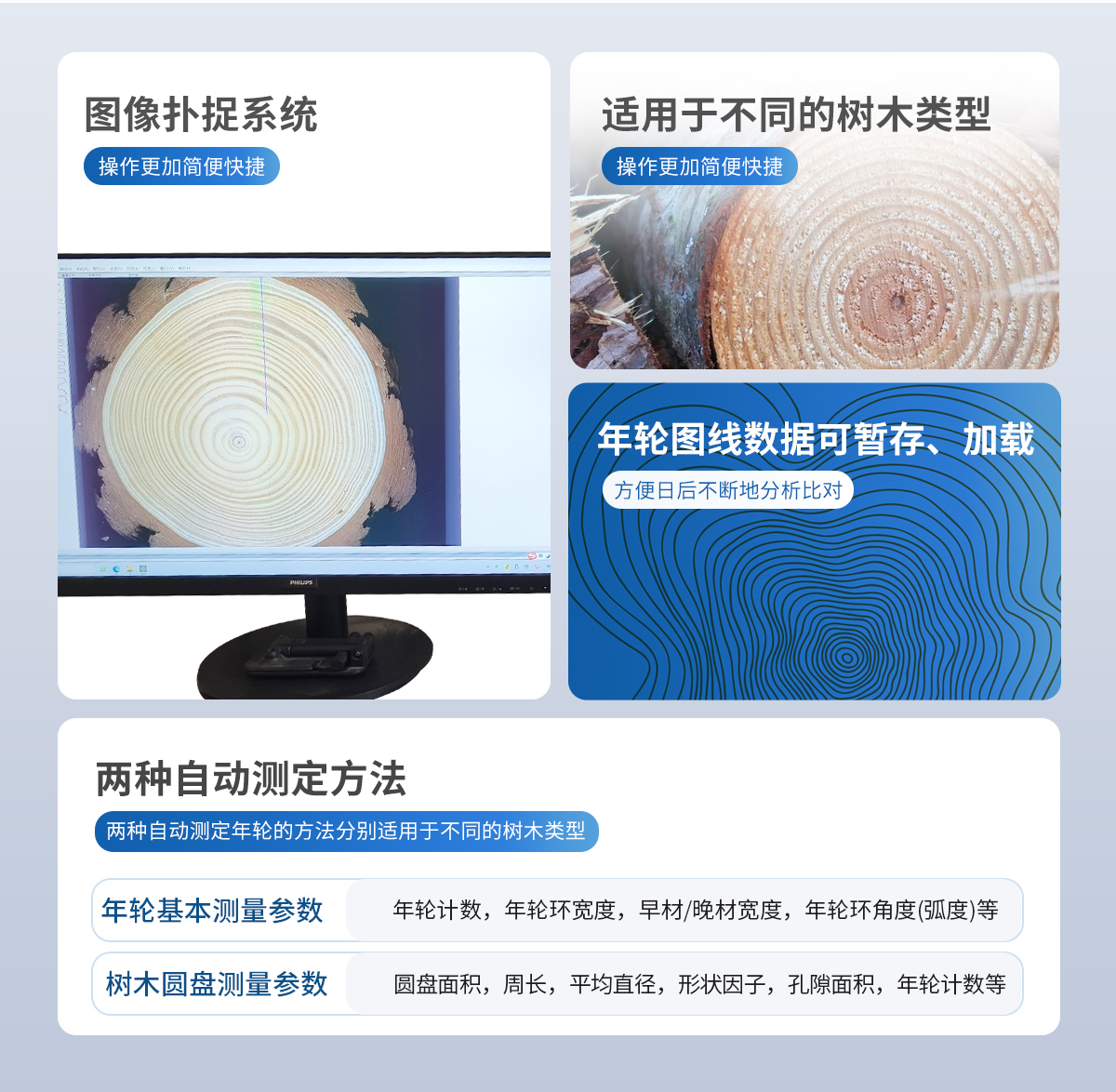 圖像撲捉系統:標準年輪樣本掃描設備,生長錐定位器等。 A4幅面:掃描面積22×30cm,投影面積20×25cm,分辨率4800DPI,可分辨*小粒子0.005mm A3幅面:超大掃描面積31×44cm,投影面積31×42cm,分辨率2400DPI,可分辨*小粒子0.011mm 年輪分析軟件:標準版分析軟件。