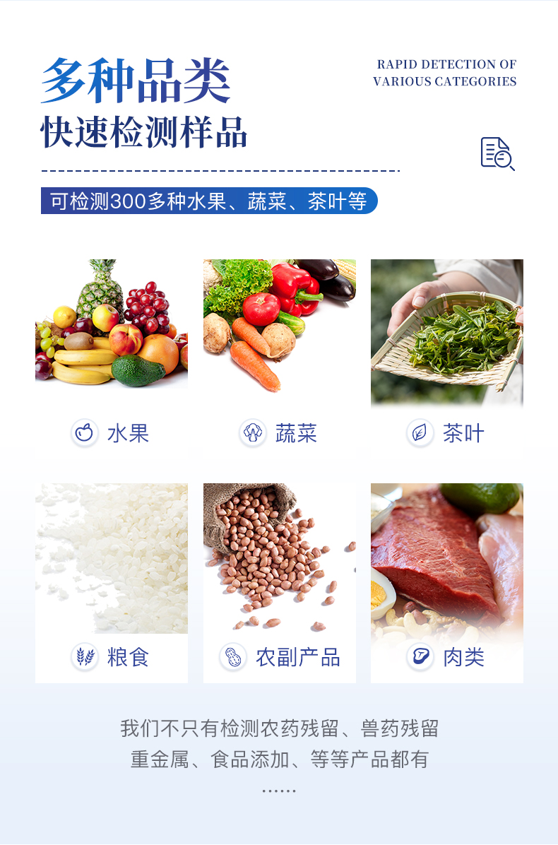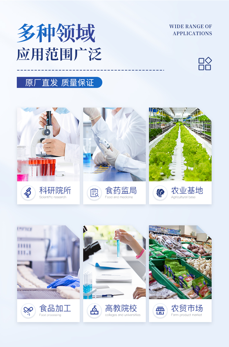 廣泛應用于主要用于蔬菜、水果、茶葉、糧食、農副產品等食品中有機磷和氨基甲酸酯類農藥殘留的快速檢測;此外還可用于果蔬茶生產基地和農貿批發銷售市場現場檢測,餐館、學校、食堂、家庭果蔬加工前的安全速測等。