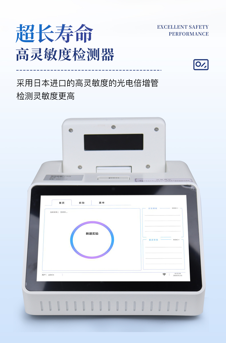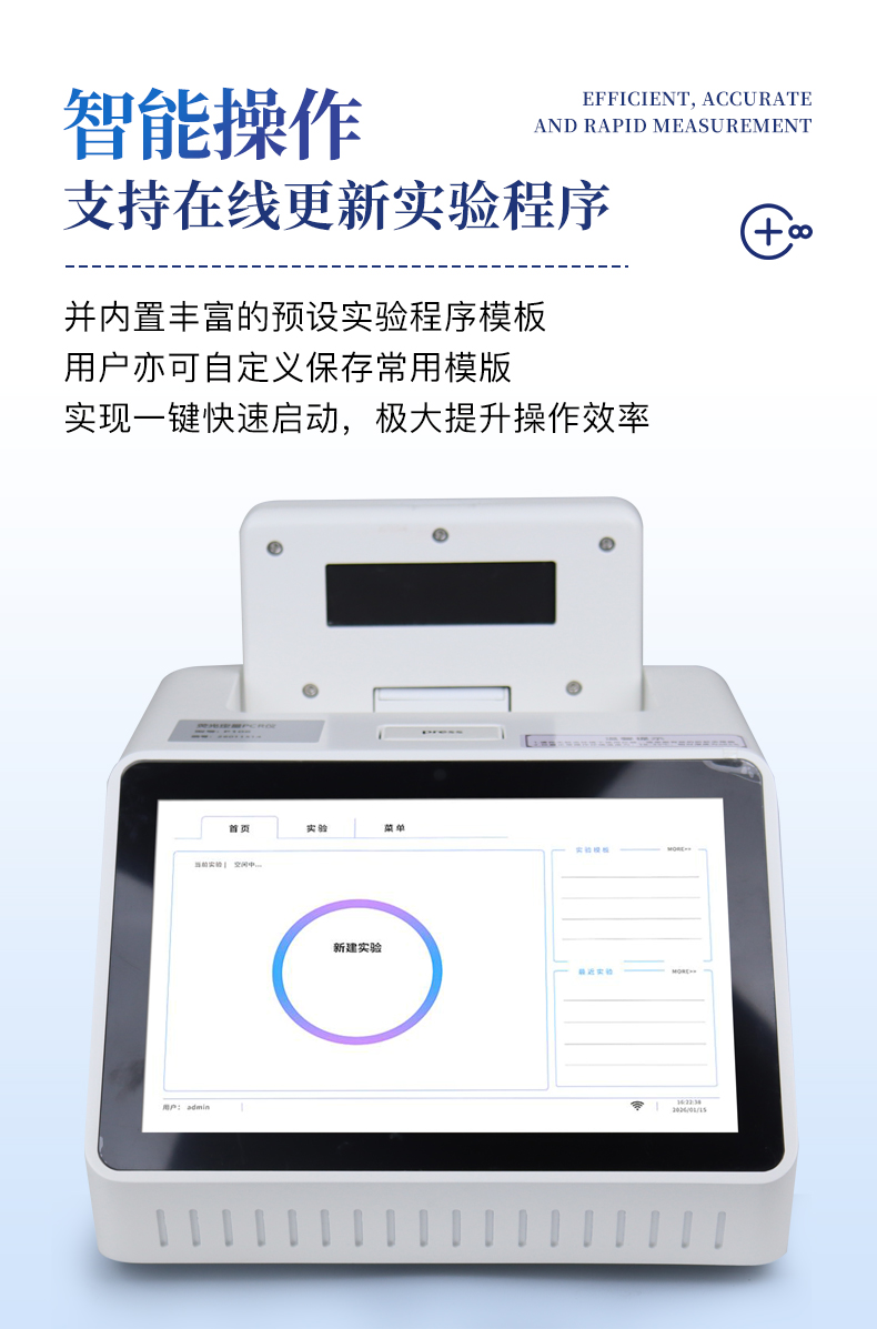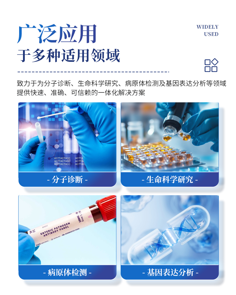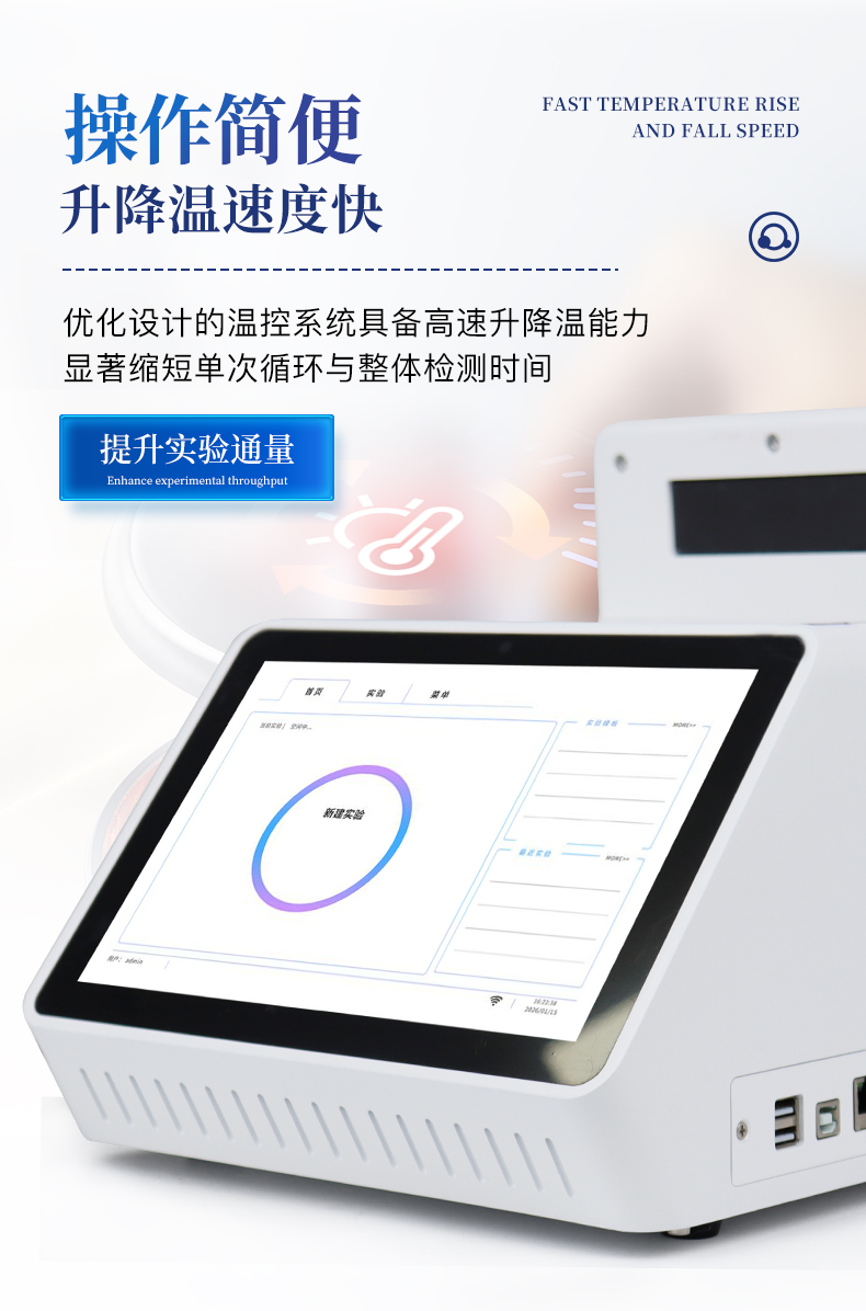 | 1.智能操作系統,實驗盡在掌握 | A雙模式靈活控制:支持通過儀器觸摸屏獨立運行,也支持通過電腦軟件進行遠程控制與數據管理,適應不同實驗場景需求。 | B程序更新與預設:支持在線更新實驗程序,并內置豐富的預設實驗程序模板,用戶亦可自定義保存常用模版,實現一鍵快速啟動,極大提升操作效率。 | C極簡啟動體驗(可選配):可定制集成攝像頭掃描系統,用戶只需掃描樣品板或程序卡的二維碼,即可自動識別并調用對應實驗程序,簡化流程,避免人為設置錯誤。 | D操作簡單:無論是觸摸屏界面還是電腦軟件,均設計得直觀易懂,新用戶也能快速上手。預置常用程序模板,進一步簡化操作流程。 | 2.精準穩定的溫控與光學核心 | A長久精準的溫控系統:采用進口***TEC半導體制冷模塊,控溫精準(±0.1°C),孔間溫度均勻性**(≤±0.3°C)。系統穩定性卓越,長期使用性能衰減小,校準周期長達數年,顯著降低維護成本與運營中斷。 | B免維護的靈敏光學系統:配備4個獨立LED光源與4個獨立光電二極管檢測器,實現四通道熒光同步精準檢測。采用超長壽命進口光源,設計壽命期內免維護,無需額外校準或更換,保障檢測結果長期一致性與高靈敏度。 | C卓越的數據質量:實驗線性相關性高(R2≥0.999),重復性優異(孔間CV值低),確保定量結果準確可靠,數據置信度高。 | 3.**便捷的數據與輸出管理 | A多重數據導出方式:支持通過USB存儲設備直接拷貝,或經由Wi-Fi無線網絡傳輸數據至本地服務器或云端,方便靈活,滿足各類實驗室數據管理習慣。 | B豐富的報告導出與打印:支持生成并導出多種格式(如PDF、Excel)的實驗報告。儀器兼容USB熱敏打印機、藍牙無線打印機及常規A4打印機,可直接在儀器上或通過電腦一鍵導出并打印專業報告,便于結果存檔與即時分享。 | 4.快速**與堅固耐用 | A升降溫速度快:優化設計的溫控系統具備高速升降溫能力,顯著縮短單次循環與整體檢測時間,提升實驗通量。 | B超長使用壽命:核心部件均選用工業級耐用材料與設計,整機運行穩定可靠,致力于為用戶提供長久的投資回報。 | 三、應用場景基礎科學研究、病原體檢測、肉制品摻假、轉基因檢測、食品安全檢測、藥物開發及合理用藥、基因表達、水體監測、松材線蟲檢測、寵物檢測、養殖業疫病檢測 |