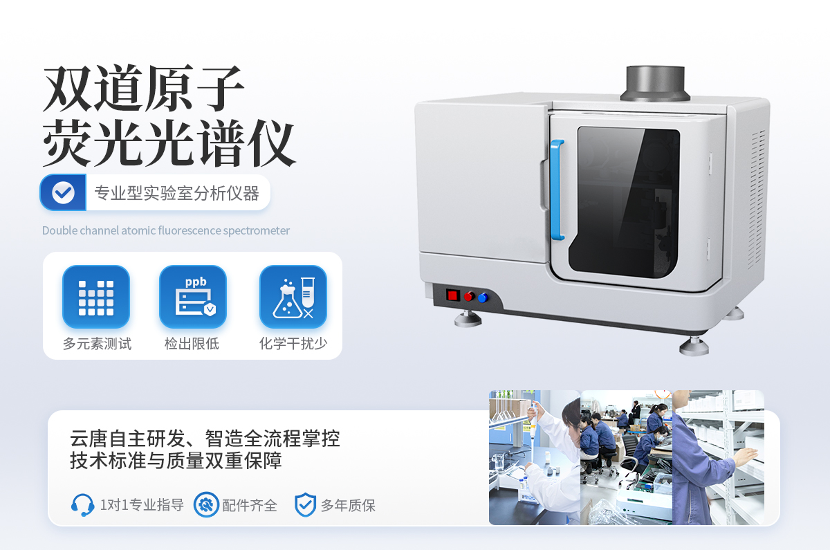 雙道原子熒光光譜儀廣泛應用于汞(Hg)、砷(As)、銻(Sb)、鉍(Bi)、硒(Se)、碲(Te)、鎘(Cd)、鍺(Ge)、鉛(Pb)、錫(Sn)、鋅(Zn)等11 種元素的痕量、超痕量分析,體積小巧,性能穩定,操作簡單。