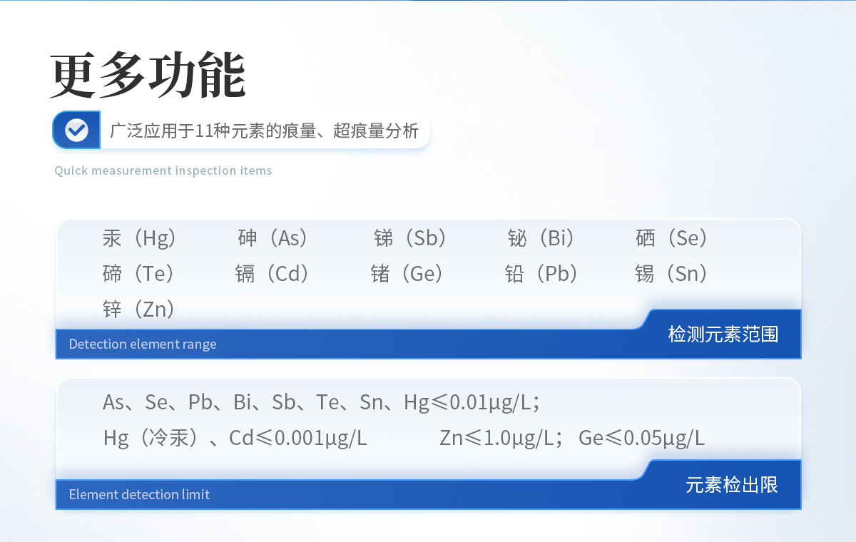 As、Sb、Bi、Hg、Se、Te、Pb、Sn、Ge、Zn、Cd 等 11 種元素。    2、元素檢出限