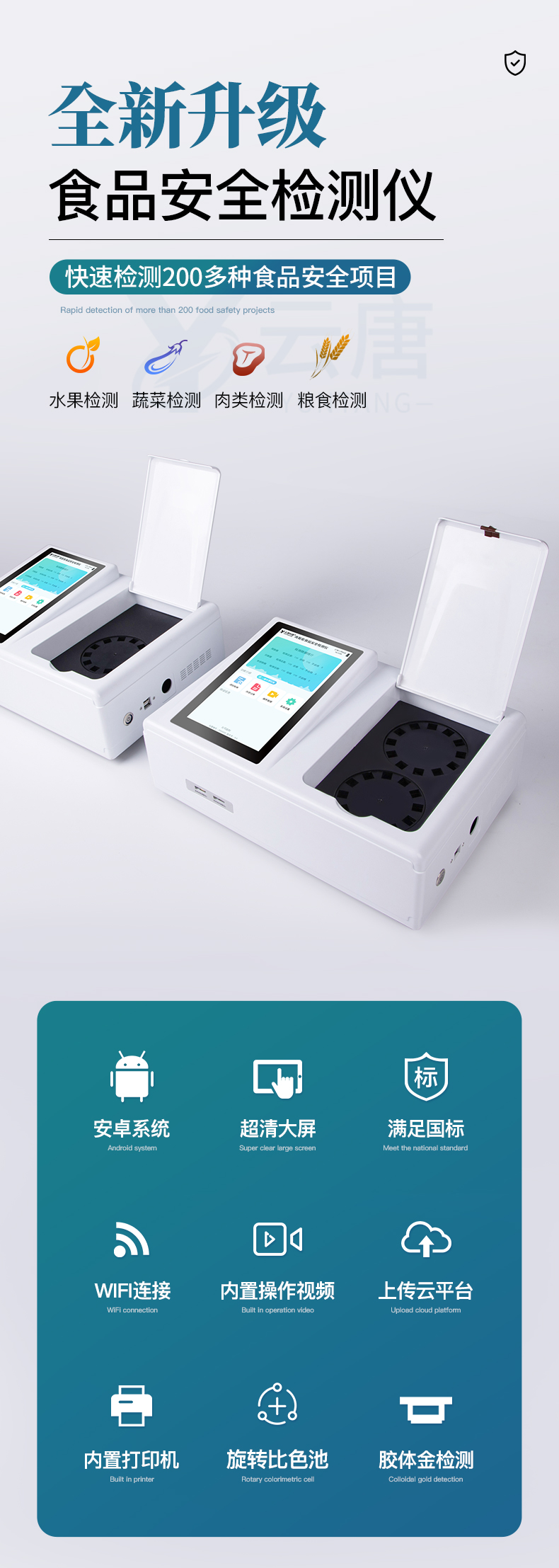 該高智能食品安全檢測儀為集成化食品安全快速檢測分析設備,目前已于食藥監局、衛生部門、高教院校、科研院所、農業部門、養殖場、屠宰場、食品肉產品深加工企業及檢驗檢疫部門等單位廣泛使用。