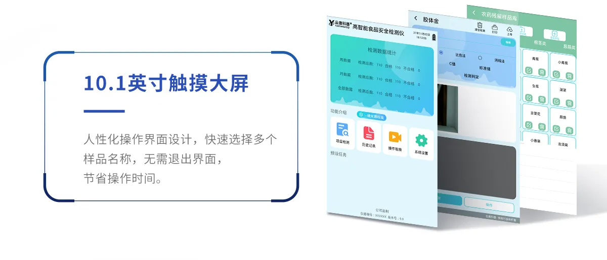 山東云唐智能科技有限公司生產的高智能食品安全檢測儀可快速檢測200多種食品安全項目,包含非食用化學物質、濫用食品添加劑、農藥殘留、獸藥殘留、重金屬、病害肉、營養強化劑、抗生素類殘留、激素類殘留、真菌毒素類殘留、化學類殘留等項目的定性定量檢測。