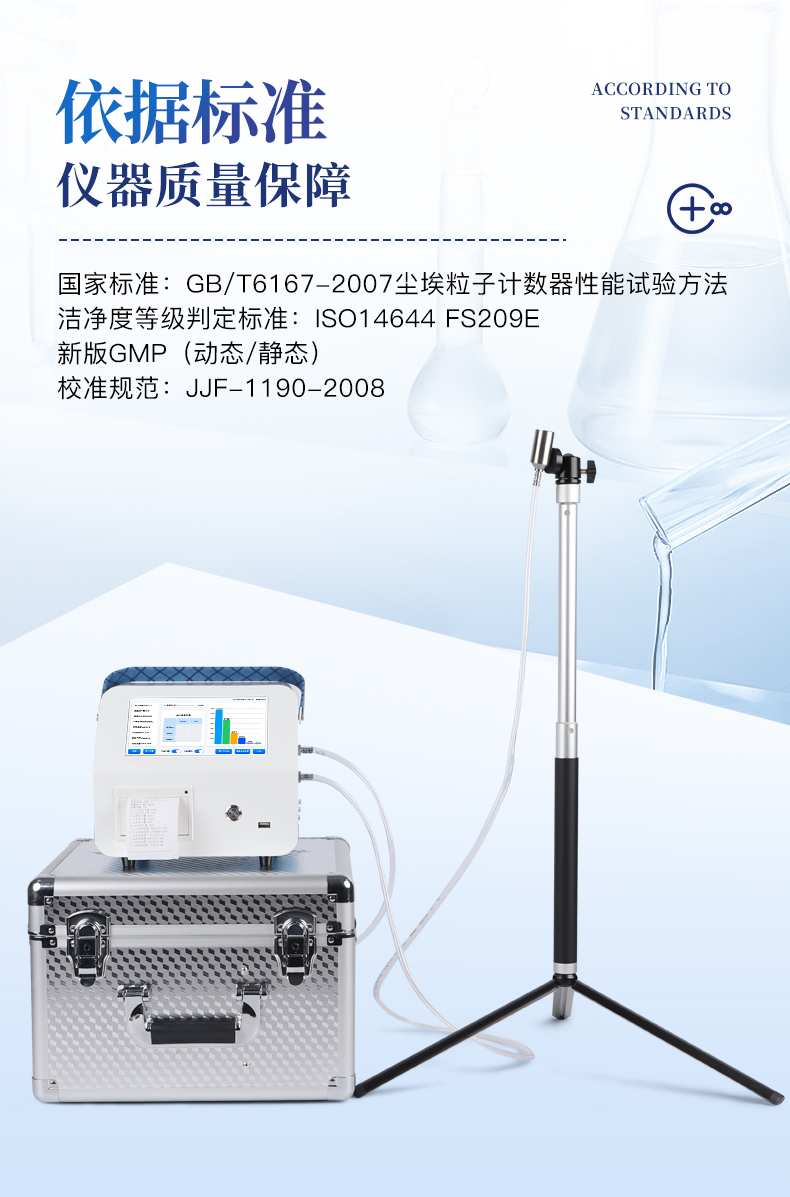 國家標準:GB/T6167-2007塵埃粒子計數器性能試驗方法 潔凈度等級判定標準:ISO14644 FS209E ,新版GMP(動態/靜態) 校準規范:JJF-1190-2008