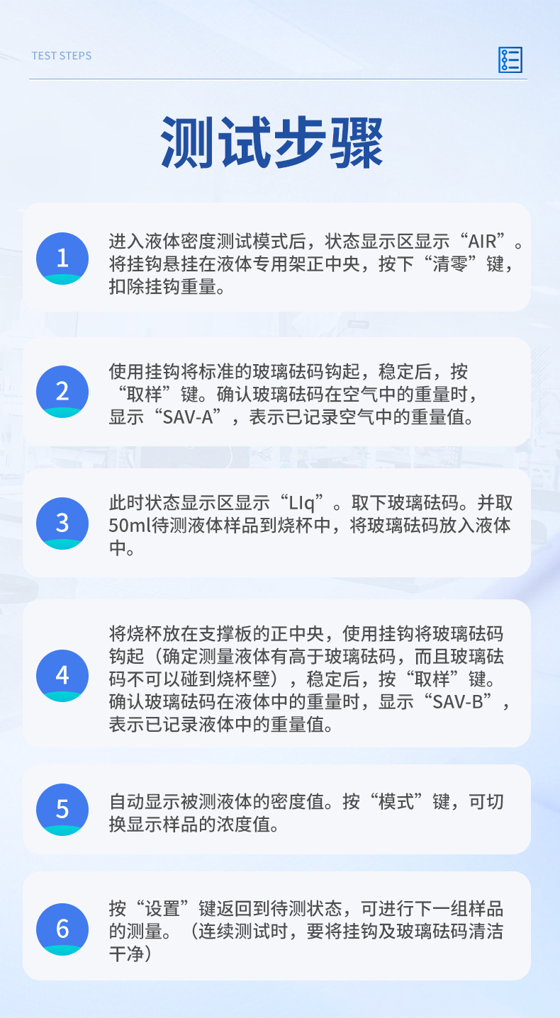 | 1、進(jìn)入液體密度測(cè)試模式后,狀態(tài)顯示區(qū)顯示“AIR”。 將掛鉤懸掛在液體專用架正中央,按下“清零”鍵,扣除掛鉤重量。 | 2、使用掛鉤將標(biāo)準(zhǔn)的玻璃砝碼鉤起,穩(wěn)定后,按“取樣”鍵。確認(rèn)玻璃砝碼在空氣中的重量時(shí),顯示“SAV-A”,表示已記錄空氣中的重量值。 | 3、此時(shí)狀態(tài)顯示區(qū)顯示“LIq”。取下玻璃砝碼。并取50ml待測(cè)液體樣品到燒杯中,將玻璃砝碼放入液體中。 | 4、將燒杯放在支撐板的正中央,使用掛鉤將玻璃砝碼鉤起(確定測(cè)量液體有高于玻璃砝碼,而且玻璃砝碼不可以碰到燒杯壁),穩(wěn)定后,按“取樣”鍵。確認(rèn)玻璃砝碼在液體中的重量時(shí),顯示“SAV-B”,表示已記錄液體中的重量值。 | 5、自動(dòng)顯示被測(cè)液體的密度值。按“模式”鍵,可切換顯示樣品的濃度值。 | 7、按“設(shè)置”鍵返回到待測(cè)狀態(tài),可進(jìn)行下一組樣品的測(cè)量。(連續(xù)測(cè)試時(shí),要將掛鉤及玻璃砝碼清潔干凈) | 儀器尺寸:195*220*190mm | 包裝尺寸:430*200*360mm | 包裝重量:4kg |