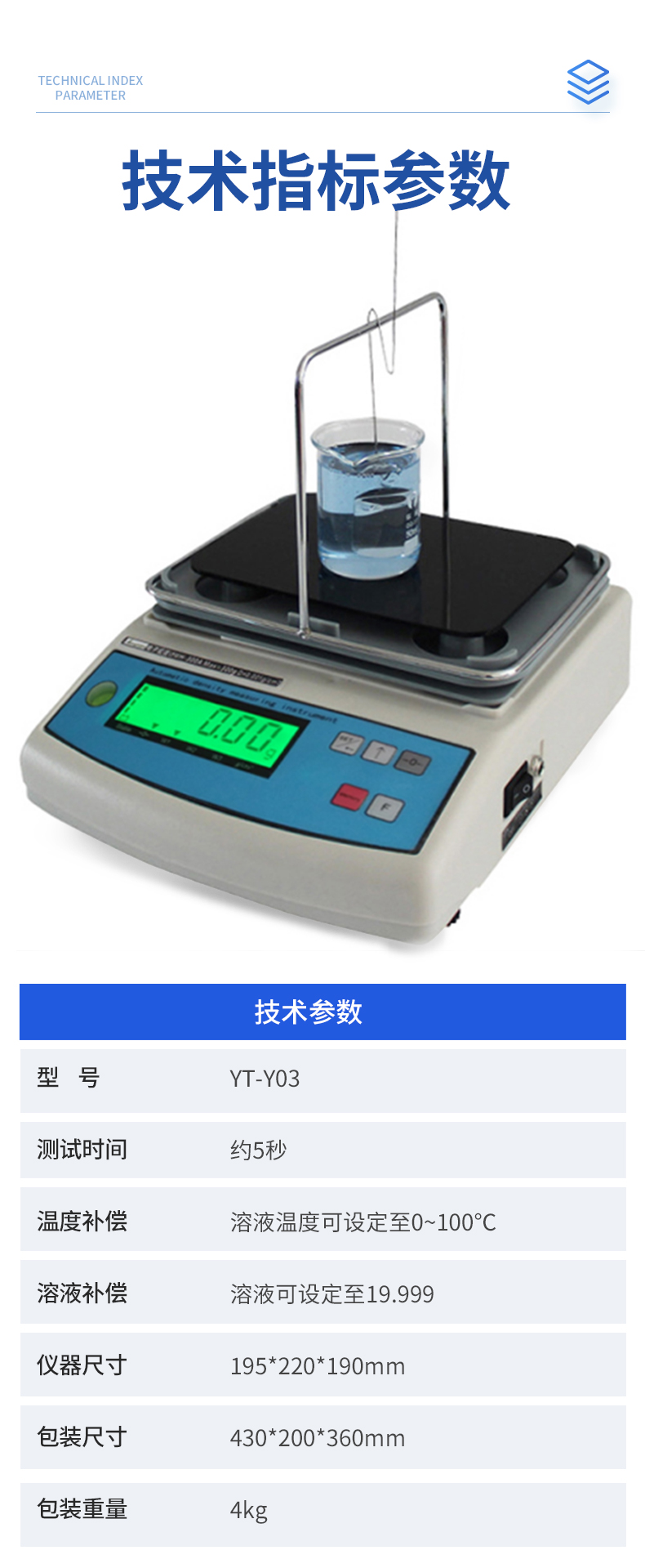 | YT-Y01 稱重范圍:0.01-300g 稱重精度:0.01g 密度精度:0.001g/cm3 | YT-Y02 稱重范圍:0.01-600g 稱重精度:0.01g 密度精度:0.001g/cm3 | YT-Y03 稱重范圍:0.005-300g 稱重精度:0.005g 密度精度:0.0001g/cm3 | 測(cè)試種類 化工溶液、化工助劑、現(xiàn)代能源、石油燃燒、藥劑、油漆涂料、瀝青、食用油等各種液體 | 測(cè)試時(shí)間 約5秒 | 顯示值 密度、體積 | 溫度補(bǔ)償 溶液溫度可設(shè)定至0~100℃ | 溶液補(bǔ)償 溶液可設(shè)定至19.999 |