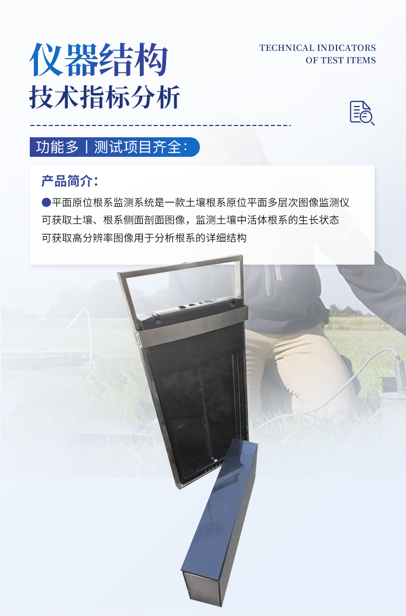 平面原位根系監(jiān)測系統(tǒng)是一款土壤根系原位平面多層次圖像監(jiān)測儀,可獲取土壤、根系側(cè)面剖面圖像,監(jiān)測土壤中活體根系的生長狀態(tài),可獲取高分辨率圖像用于分析根系的詳細結(jié)構(gòu)。
