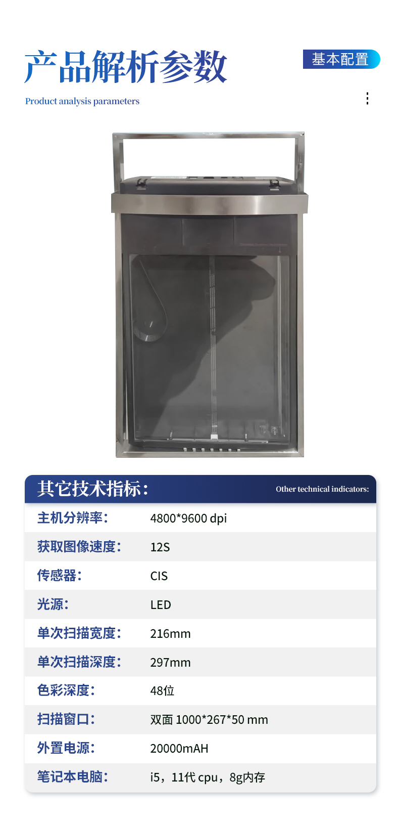 主機分辨率:4800*9600 dpi    獲取圖像速度:12S    傳感器:CIS    光源:LED    單次掃描寬度:216mm    單次掃描深度:297mm    色彩深度:48位    掃描窗口:雙面 1000*267*50 mm    外置電源:20000mAH    筆記本電腦:i5,11代 cpu,8g內(nèi)存
