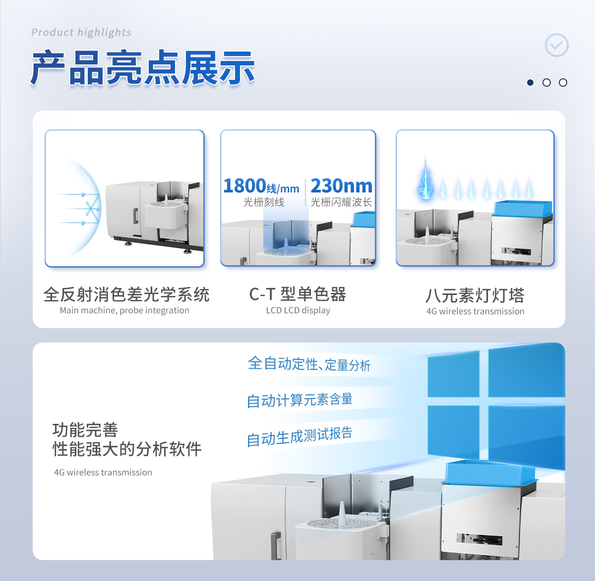 采用 1800 L/mm、閃耀波長(zhǎng) 230nm 光柵作為分光系統(tǒng)。 3、八元素?zé)魺羲?br/>八燈座設(shè)計(jì),八路獨(dú)立燈電源,一燈工作,可以實(shí)現(xiàn)七燈預(yù)熱,節(jié)省了換燈和預(yù)熱時(shí)間。 4、全自動(dòng)化設(shè)計(jì)
